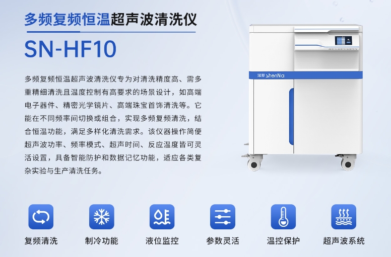 多频复频恒温超声波清洗仪专为对清洗精度高、需多重精细清洗且温度控制有高要求的场景设计,如高端电子器件、精密光学镜清洗等。它能在不同频率间切换或组合,实现多频复频清洗,结合恒温功能,满足多样化清洗需求。该仪器操作简便,超声波功率、频率模式、超声时间、反应温度皆可灵活设置,具备智能防护和数据记忆功能,适应各类复杂实验与生产清洗任务。